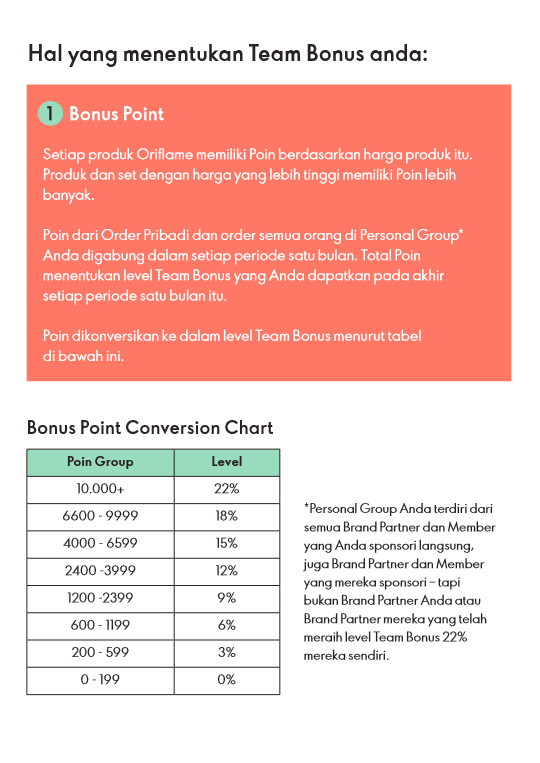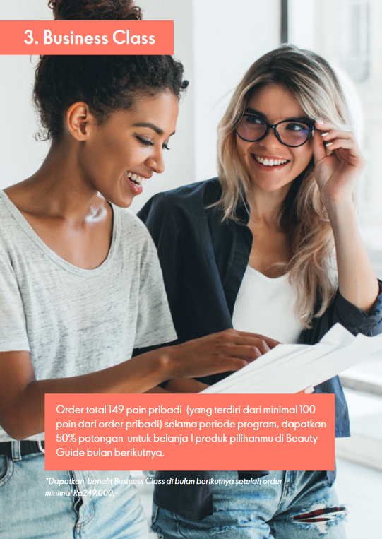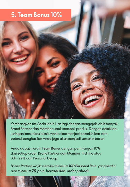 - Referral Bonus 10% dari penjualan pribadi dan member. (100/299) points. Maksimal untuk personal poin adalah 1000, dibayar dari harga Beauty Guide.