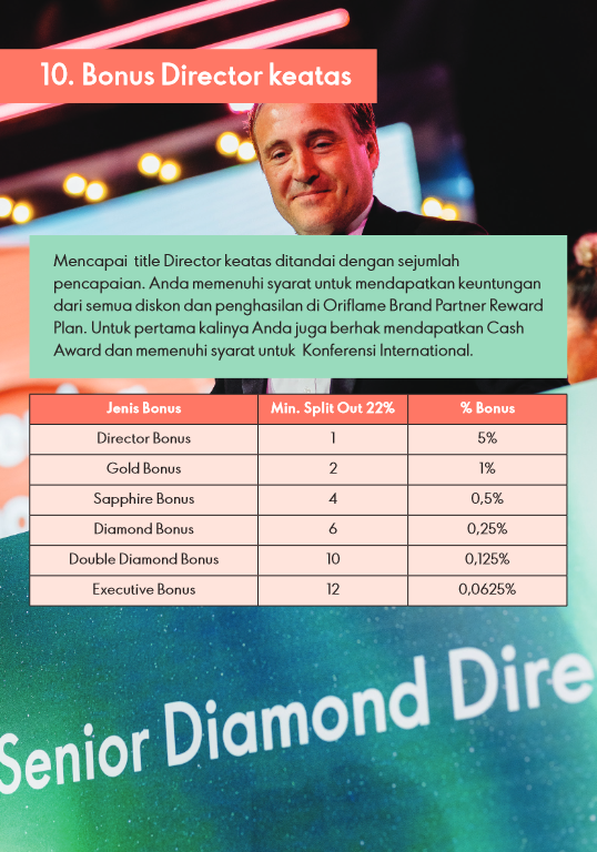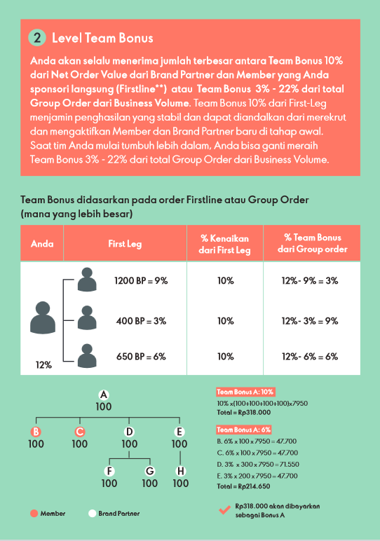 - Bonus jaringan atau Team bonus 10% hingga 21%.