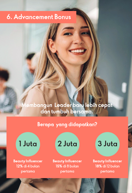 - Kesempatan berkarir untuk mendapatkan Advancement Bonus 6 juta dan Cash Awards mulai dari 10.000.000,- semua bisa di capai dalam 12 bulan pertama sejak bergabung.